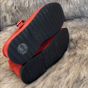 Bold red suede platforms with a classic Mary Jane strap. Elevate your style effortlessly. In good condition. Approximately a 2” heel.