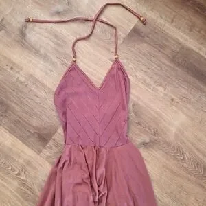 Free People Intimately halter dress in a rich burgundy wine hue. This bohemian-inspired piece features a pointelle knit bodice with a flattering V-neckline and a flowy handkerchief hem skirt. The halter neck is accented with delicate wooden bead details and ties for an adjustable fit. A low open back with a zipper closure adds a touch of allure to this versatile midi-length dress, perfect for festivals, summer outings, or casual evening wear.