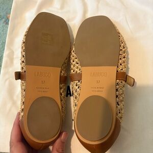 Labucq Lido Mary Jane ballet flats in natural raffia. Woven raffia ballet flat with vegetable-tanned leather trim and maryjane strap. In excellent condition, very lightly worn. Size 37 which is a US 6.5-7 per size chart. Comes with dustbag.