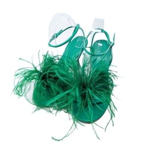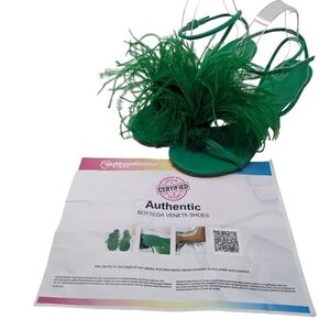 Bottega Veneta heels, Bottega Veneta sandals, Bottega feather heels, green designer heels, luxury women’s shoes, Italian designer footwear, runway heels, high fashion sandals, statement heels, EU 38 designer shoes