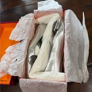 Chic Tory Burch flats in metallic silver. Features a sparkling embellished bow. Size 7.5. Some wear at the toes, see photos.