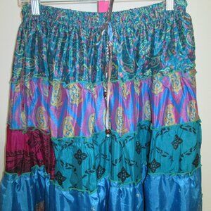Make a statement with this stunning Wevez tribal patchwork skirt, bursting with rich Blues, dark red and gold. Designed with a bohemian, global-inspired aesthetic, this skirt features layered patchwork panels with intricate patterns and textures that give it a unique, handcrafted look.