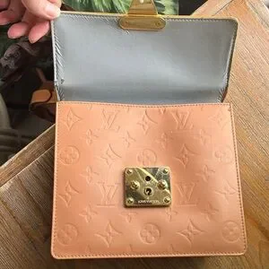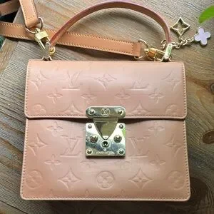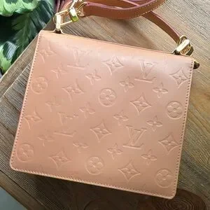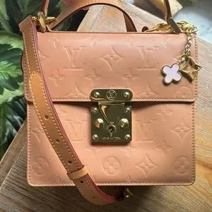Chic Louis Vuitton crossbody top handle bag in peach color with signature embossed monogram. Features gold tone hardware and added unbranded charm detail. Crossbody strap is unbranded and detachable. Painted vernis leather. Ideal for stylish outings. Pairs well with jeans and blouse for a casual look, or with a flowy dress in the spring! Tiny enough to not be bulky, and large enough to hold all the essentials! Has locking mechanism, use notch to lock and unlock.