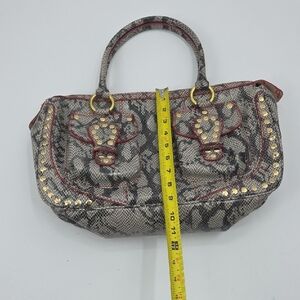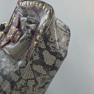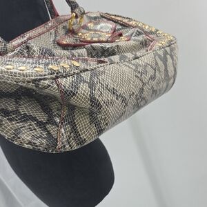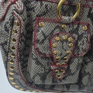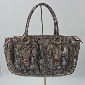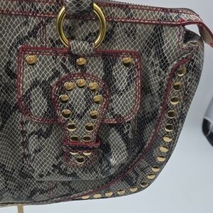Stylish handbag with a unique snakeskin pattern and gold accents. Perfect for adding a touch of sophistication to any outfit. Gently used and in great condition!