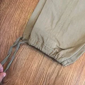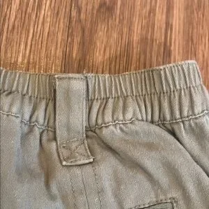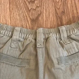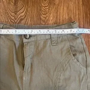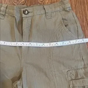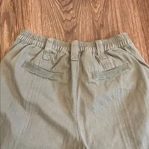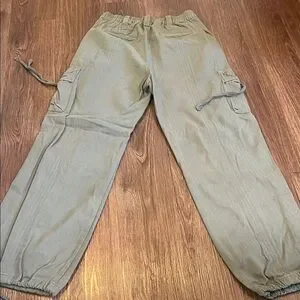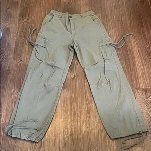 Discover these versatile green cargo pants by Jacqui E. Ideal for everyday wear. Features multiple pockets and adjustable ties.