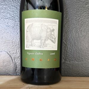 La Spinetta Barbaresco Vigneto Gallina 2006 wine bottle with a green label. Features a detailed illustration of a rhinoceros. Rare bottle to find nowadays
