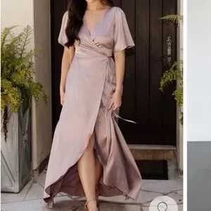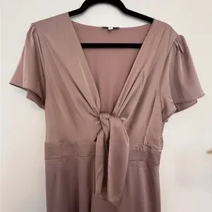Chic midi dress with a tie-front detail. Flowy and elegant design. Perfect for events and wedding guests.