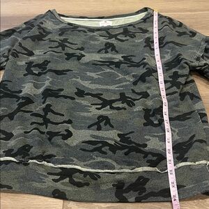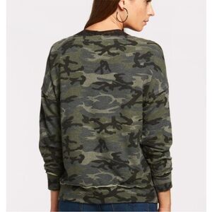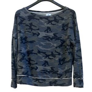 Sundry off the shoulder camo print top in EUC (no visible flaws, very mild signs of washing wear). Size listed is Sundry 1, which is US size small. The top is oversized/relaxed. Approximate measurements: length 24”, 22” pit to pit laying flat. The seam lines along bottoms and cuffs have a kind of raw edge look and make it look more vintage.