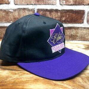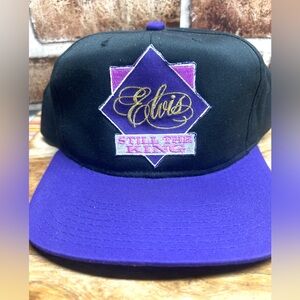 Vintage “Elvis Still The King” Snap Back Hat Music Rock Vintage. The hat features "Elvis" in a gold script logo above the phrase "STILL THE KING" on a purple diamond-shaped patch.