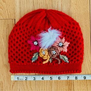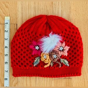 Handmade red crochet beanie for women or teens. Fully lined with a flower and feather motif. For smaller head sizes (see pictures for measurements). In excellent used condition.