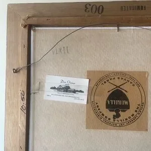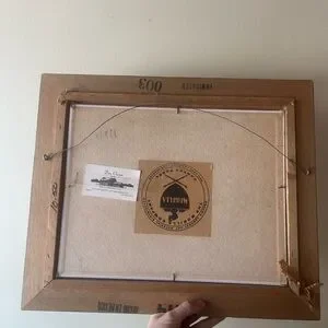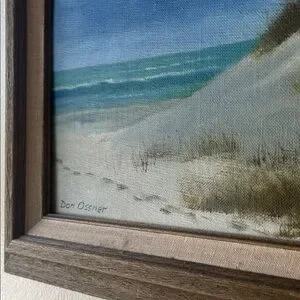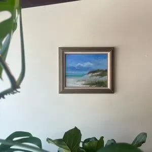 Beautiful coastal landscape painting in a wooden frame. Features serene blue and green tones.