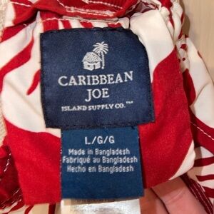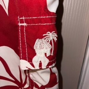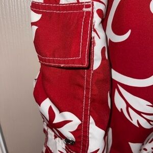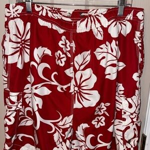 Caribbean Joe swim trunks. Red & white Hawaiian style floral print. Two side pockets & one inner pocket. Great condition.