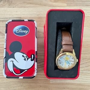 Description: tinker bell on round dial, fairy wings as watch hands, gold tone watch
