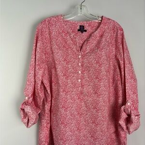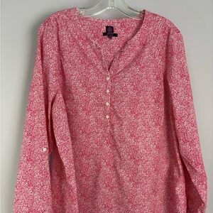 Women’s Liberty Art Fabrics pullover top in a pink and white floral print. 100% cotton fabric is lightweight with no stretch. Machine wash. Has a split neckline with partial front button closure, roll tab sleeves, pintuck stitching below the shoulders, and split hem. Size on tag is XXL. Approximate measurements, taken flat: Armpit to armpit: 25.5” Shoulders, front seam to seam: 17.5” Top of middle of shoulder to hem: 27” Width across hem and doubled: 56” Sleeves from cuff to shoulder seam: 24.5”, cuff to middle of back of neck: 31” Bicep circumference: 18” Great condition. Has been cleaned and is ready to wear.