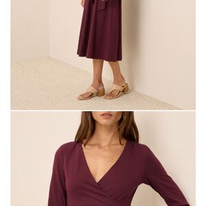 This elegant burgundy dress features long sleeves and a flattering tie waist. Perfect for any occasion, it offers both style and comfort.