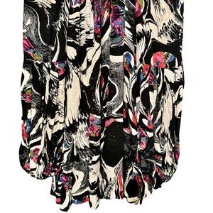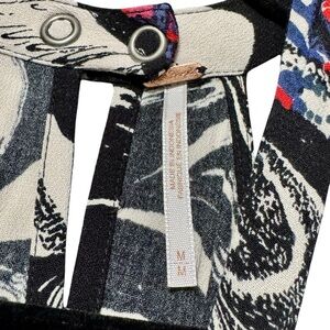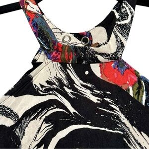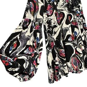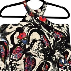 Bold abstract floral print in shades of black, white, red, blue, and pink