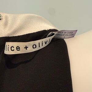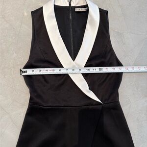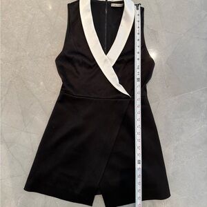 Alice + Olivia Mardell Tuxedo Romper in Black and Off-White satin crepe fabric with over skirt design features a sleeveless construction and contrast off-white collar make this play suit both sexy and incredibly cool. Back zipper closure. Size 2. Worn once and in excellent condition.