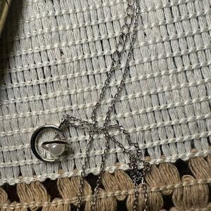 This elegant and dainty silver 925 necklace features a delicate moon pendant with a pearl planet and silver ring around the planet, perfect for adding a touch of sophistication to any outfit. Its sleek design makes it a versatile accessory for any occasion. Pendant and necklace are both silver 925. Necklace is approx 16” long with 2” extender.