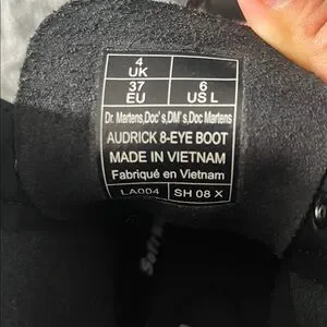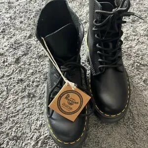 Bold black combat boots with chunky sole. Iconic Dr. Martens style. Perfect for edgy looks.