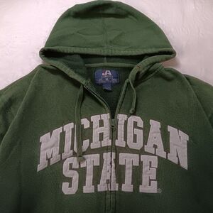 Stylish forest green Michigan State hoodie with zip closure. Features a comfortable fit and cinch hood. Size XL
