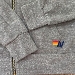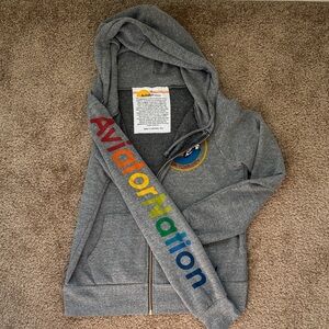 Cozy gray hoodie with colorful rainbow stripes. Features vibrant logo on chest and sleeve.