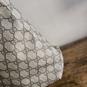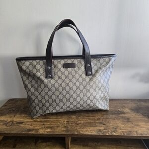 Stylish Gucci tote with iconic monogram pattern. Features sturdy black handles. Perfect for daily elegance.