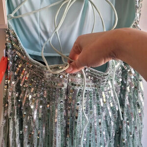 Angled rows of hand-stitched sequins featured along bodice and skirt