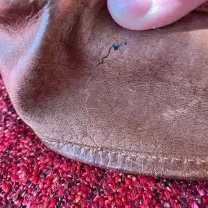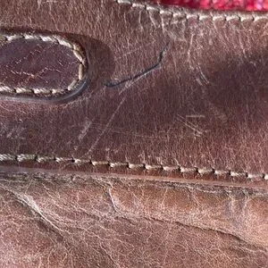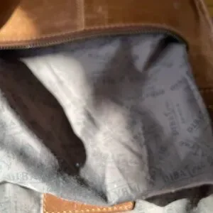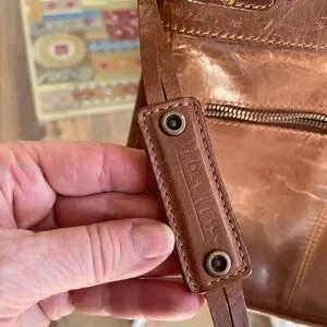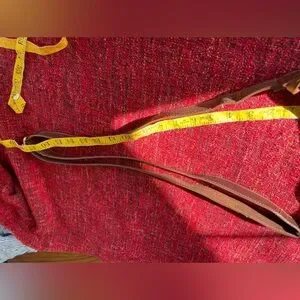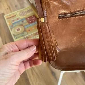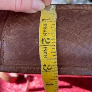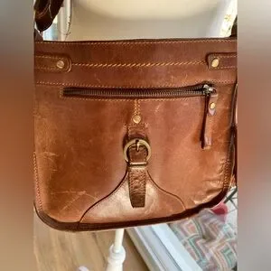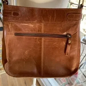 10 x 10 z 3 . Zipper pockets on front and back and one inside and a small phone pocket. Color saddle brown. Could use a good leather cleaning to cover wear - hence the lower price. And 2 small pen marks one on back and one on side. See the pics. Features a secure zip closure and adjustable strap (about 28 “ to 50”). for comfort.