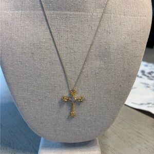 This elegant cross pendant necklace combines gold and silver tones, offering a sophisticated touch to any outfit.