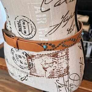 leather belt, studded belt, western belt, boho belt, turquoise accent, tan leather, Steve Madden, festival belt, casual accessory