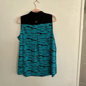 Jamie Sadock Sunsense sleeveless golf polo featuring a bold turquoise and black tiger stripe animal print. High mock neck with quarter-zip front and signature triple stud detail on the back yoke. Lightweight moisture-wicking tech fabric with stretch (92% Polyester, 8% Spandex). Excellent condition. 21" pit to pit, 26" length.