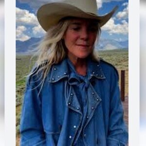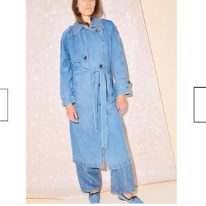Amazing coat! Just a little too big for me. Studded blue denim trench coat. Heavy enough for cold weather, perfect for layering.