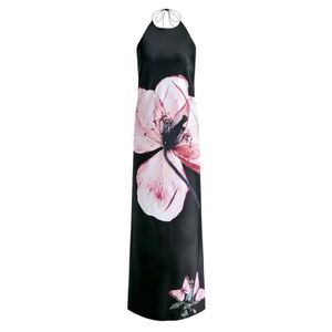 This stunning black maxi dress features a beautiful pink floral design, perfect for any special occasion. The elegant silhouette and chic style make it a must-have addition to your wardrobe.