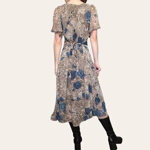90s vintage chiffon midi dress. Tan and brown with a blue floral pattern, sheer sleeves, tie back, v-neck, and flowy hemline. So cute paired with knee high boots!