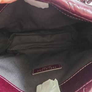 Features: chain top handle, leather crossbody strap, silver tone hardware, lined.