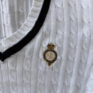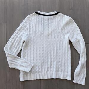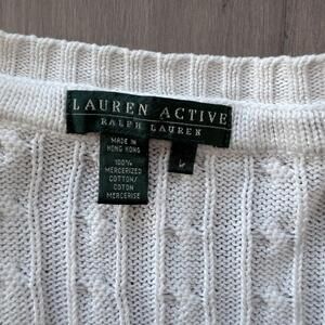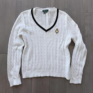 Lauren Active by Ralph Lauren white cable knit sweater featuring a V-neck with black trim. Made from 100% mercerized cotton for a soft and comfortable feel. Embroidered logo detail on the chest adds a classic touch. Size Large.