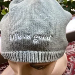 This olive beanie keeps youwarm and stylish. Features a playful embroidered design. Life is good beanie