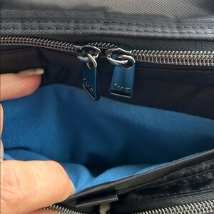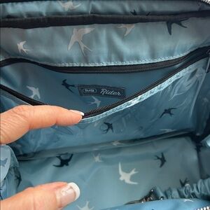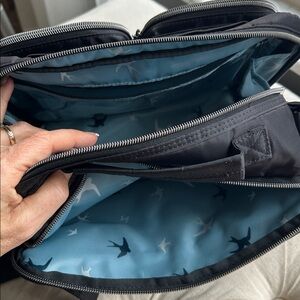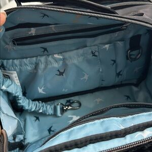 I bought this bag to use for a trip, but I ended up using my other Lug instead. This bag has so many compartments. I included the measurements from the website and photos so that you could see the rainbow quilting. It has the two front zipper pockets behind. It is a magnetic clothes pocket. There’s a clear zipper pocket in the middle with a bungee clasp another zipper pocket to pen holders in an elastic pocket then there’s another hole zipper pocket in the back in a pocket with a snap. All that saying there is a side snap enclosure that opens for a water bottle.!