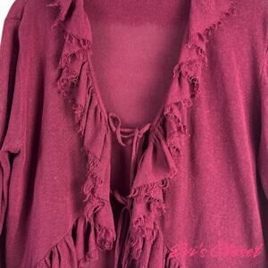 Elevate your wardrobe with this beautiful Zara linen blend cardigan top. The rich burgundy aubergine color is perfect for adding a touch of sophistication to any outfit. Featuring a tie front closure and delicate ruffled trim, this long-sleeve cardigan offers a light and comfortable fit.