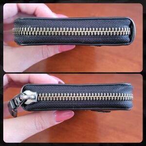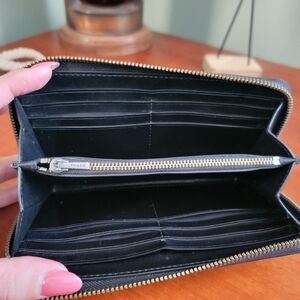Three quarter zipper closure with gusseted sides and leather zipper pull. Interior is smooth black leather and has 2 gusseted compartments and a full-width center zipper pocket. It has room for 12 cards and has 2 slip pockets.