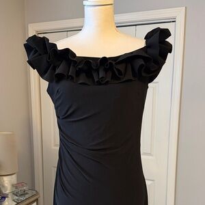 This elegant black off-shoulder dress is perfect for any formal occasion. The ruffled neckline adds a touch of sophistication and style. The sleek classic cut is extremely flattering. Fabric has great stretch. Slit up the back hem. Gorgeous, pretty, statement formal dress. Classic, timeless, fabulous! NWT 19" so 38" and waist 32" around - both with really good stretch. Love this dress. Wear it again and again!