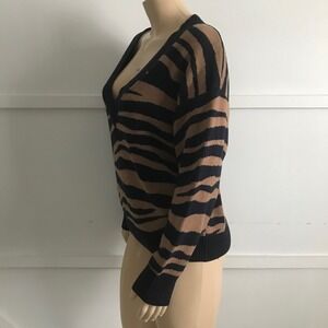 Keywords: Animal Print, Tiger Stripe, Zebra Stripe, Oversized, Relaxed Fit, Cozy, Fall Fashion, Winter Layering, Streetwear, Contemporary, Neutral, V-Neck Sweater