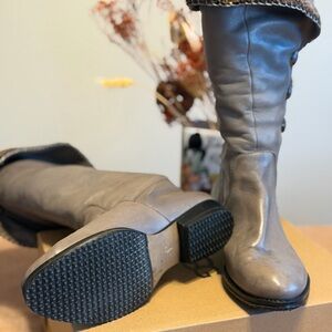 Stylish gray genuine leather women's boots with a cozy lining. Perfect for a chic and comfortable look. New added sole. The bottoms work. Great for winter days.