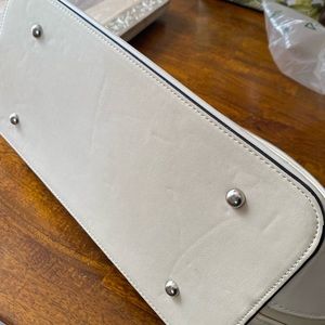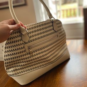On-trend woven doctor-style bag with tasseled details in a neutral cream and beige palette. Features multiple interior pockets and a convenient exterior zip pocket for added functionality.