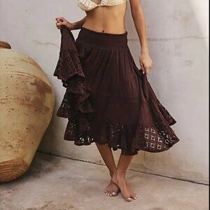 Effortless and versatile Free People skirt from the free-est line, relaxed, flowy fit with a ruched elastic waistband and delicate lace detailing throughout for subtle texture. The handkerchief hem adds movement and a feminine finish. Wear it as a midi skirt or style it as a strapless mini dress for an easy, boho look.