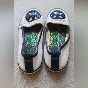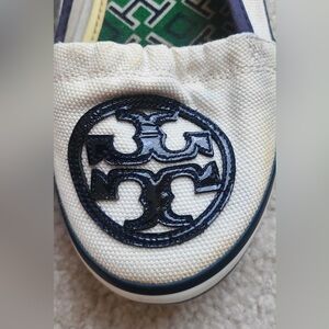 Tory Burch White and Navy Canvas slip ons