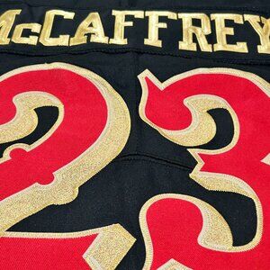 The product is a Christian McCaffrey #23 San Francisco 49ers Men's Alternate Game Jersey in size Large. It is an officially licensed Nike jersey designed for football fans who support the San Francisco 49ers. This red jersey is perfect for wearing during the regular season games to show support for the team and player. It is an essential piece of fan apparel for any Christian McCaffrey and San Francisco 49ers enthusiast.