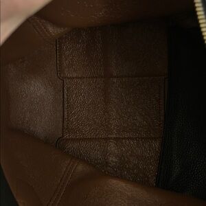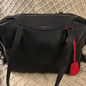Elegant black leather satchel with striking red accent. Features dual handles and a detachable strap. Perfect for versatile styling.