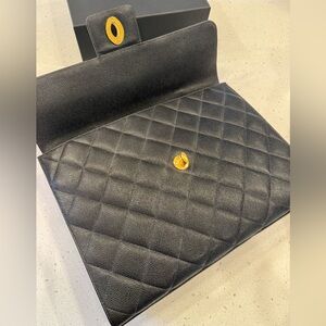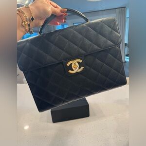 Authenticated vintage Chanel classic quilted 24 karat gold plated Caviar leather briefcase with a top handle.
