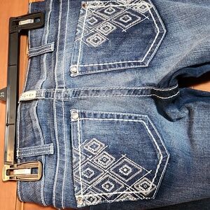 Chic boot cut jeans by Ariat. Classic blue with stylish stitching. Perfect for casual wear.
